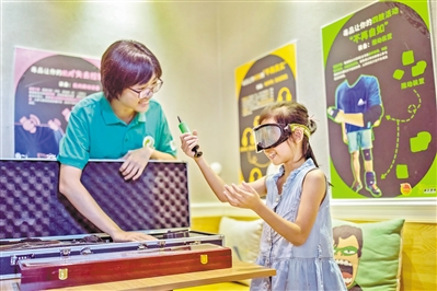 广州市海珠区“青年地带”。社工正在给社区里的小朋友戴上禁毒模拟眼镜和肌肉跳动设备,让他们体会吸毒者产生视觉错觉,感受肌肉失去控制的痛苦,从而远离毒品。