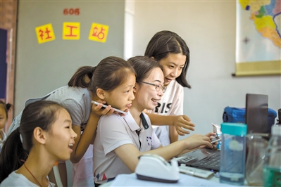 广州市花都区美东工业园社工站。暑假期间,社工姐姐和“小候鸟”建立起深厚的友谊,她们亲昵地趴在社工姐姐的肩头,一起歪着头欣赏照片。