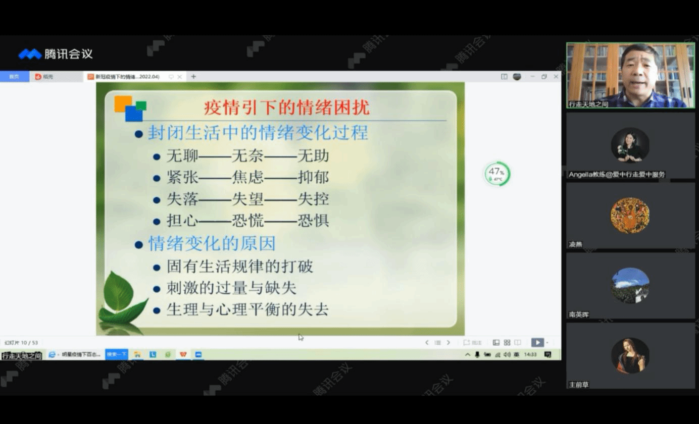 4月10日是公益讲座第一场,张可创教授就当前上海疫情形势,对人们在封闭管控期间所产生的紧张焦虑等消极情绪做出分析,并结合自身实践经验和研究成果,将理论联系实际,提出情绪管理五部曲、5W自我情绪分析法等方法;根据专业分析,指出如何应对疫情所带来的情绪困扰,即应做到修心、养心、建心的有机统一;同时提出“营养饮食、按时休息、适当运动”的生活小妙招。