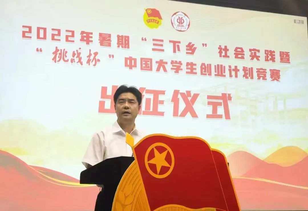 活动中,胡钦太为我校参加第十三届“挑战杯”中国大学生创业计划竞赛的团队授旗,并预祝队员旗开得胜、载誉归来。陈卓武为参加暑期社会实践的重点团队代表授旗。