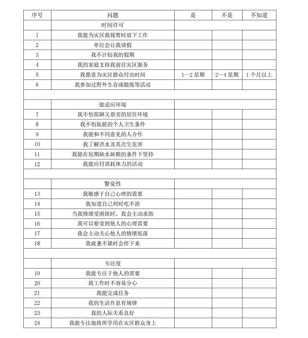 3.如果你回答“是”的数目不足15条,则暂时仍未作好心理准备前往灾区参与支援工作。如果你需要在灾难发生后短时间内前往灾区参与支援工作,你将会面对更大的挑战,我们建议你再审视一下自己是否符合以下17项标准:
