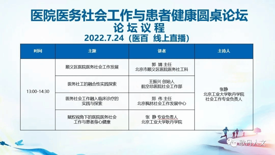 2022年7月24日下午,北京工业大学耿丹学院社会工作专业顺利举办了“医院医务社会工作与患者健康”在线圆桌论坛,该会议为中国心理健康服务融合发展大会第一届心理与精神健康教育委员会年会的分论坛之一。本次论坛由耿丹学院社会工作专业负责人、北京市顺义区医院客座治疗师张静主持,特邀北京市顺义区医院医务社工部主任、团委书记郭婧,中国医科大学航空总医院社会工作部创始人、北京医院协会医务社会工作专委会副秘书长王振兴,北京枫林社会工作发展中心主任郑伟等嘉宾作专题报告。中国心理健康服务融合发展大会参会人员在线参与论坛研讨。